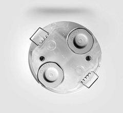 - Khoan một lỗ trên trần nhà với đường kính 65mm và sau đó cho dây cáp nguồn xuyên qua nó, dùng tuốc nơ vít đục một lỗ xuyên qua miếng đệm cao su ở trên nắp bảo vệ, và cho cáp nguồn đi qua nó. Đấu nối cảm biến chuyển động theo sơ đồ. Gióng thẳng nắp bảo vệ với đường rãnh và bắt vít chặt lại. Đưa cảm biến vào lỗ đã khoan, đồng thời bóp 2 lò xo cho qua lỗ, sau đó thả ra để lò xo kẹp giữ thiết bị với trần nhà.